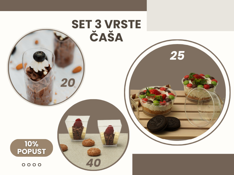 Sasvim sigurno, nešto što je zauzelo primat kada je serviranje slatkih stolova i deserata u pitanju, posebno na slavljima kao što su venčanja, poslovni kokteli, razni prijemi jesu deserti u čašama. Ako odete korak dalje, desertne čaše ne moraju da budu namenjene samo za deserte, već i za serviranje zdravih napitaka, voćnih salata, obrok salata, kremova, mini tortica, musova i slično.