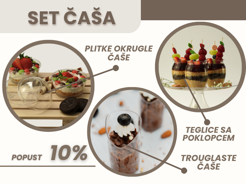 Sasvim sigurno, nešto što je zauzelo primat kada je serviranje slatkih stolova i deserata u pitanju, posebno na slavljima kao što su venčanja, poslovni kokteli, razni prijemi jesu deserti u čašama. Ako odete korak dalje, desertne čaše ne moraju da budu namenjene samo za deserte, već i za serviranje zdravih napitaka, voćnih salata, obrok salata, kremova, mini tortica, musova i slično.